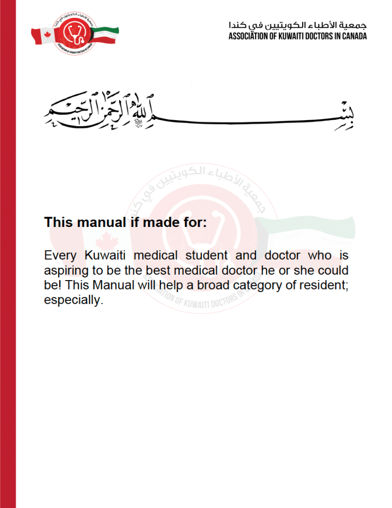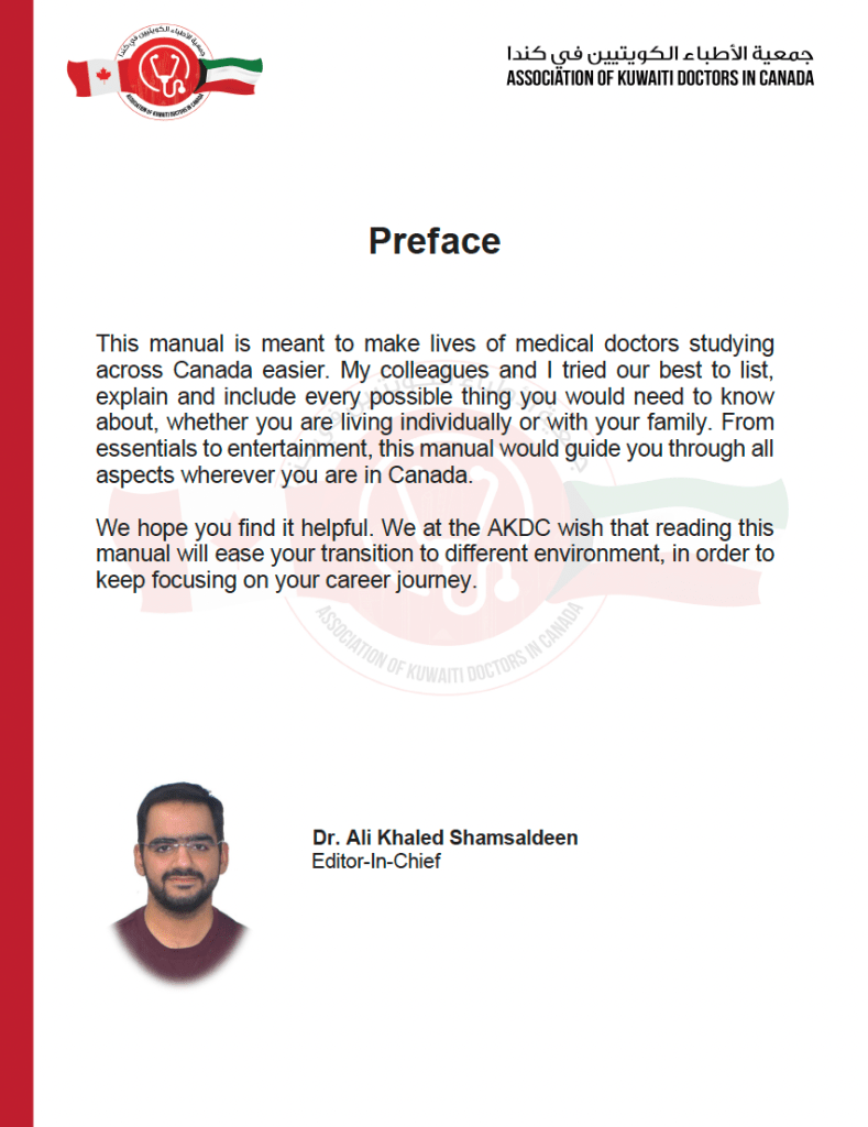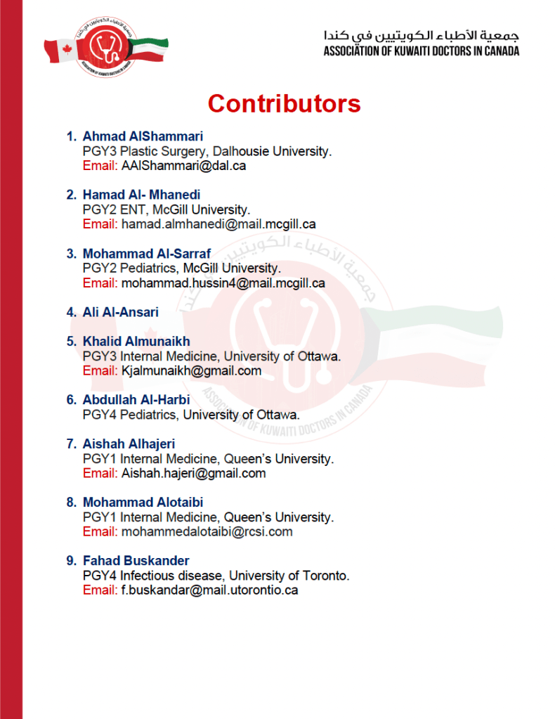 قام بإعداد هذا الدليل مجموعة من الأطباء والمقيمين في كندا حالياً ولا يسعنا في هذا المقام إّلا أن نتقدم لهم بجزيل الشكر وعظيم الامتنان لما قدموه من جهد ومعلومات قيمة، والتي نأمل بأن تكون مفيدة لجميع القرّاء.